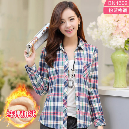 纯棉格子保暖衬衫 女长袖秋冬加绒加厚韩范修身打底大码女装衬衣